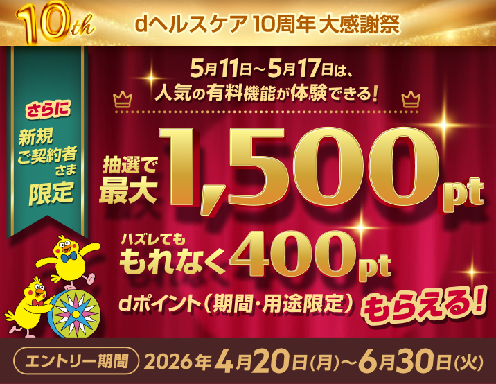 【dヘルスケア10周年記念】人気有料機能おためし&最大1500ptもらえるキャンペーン