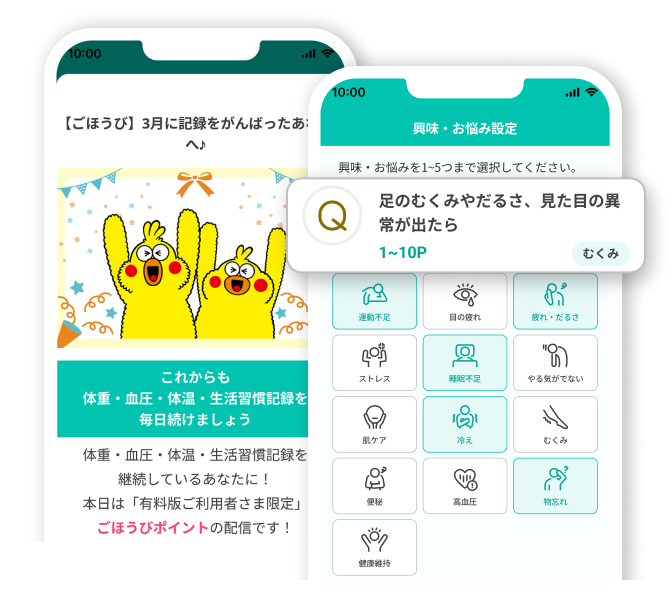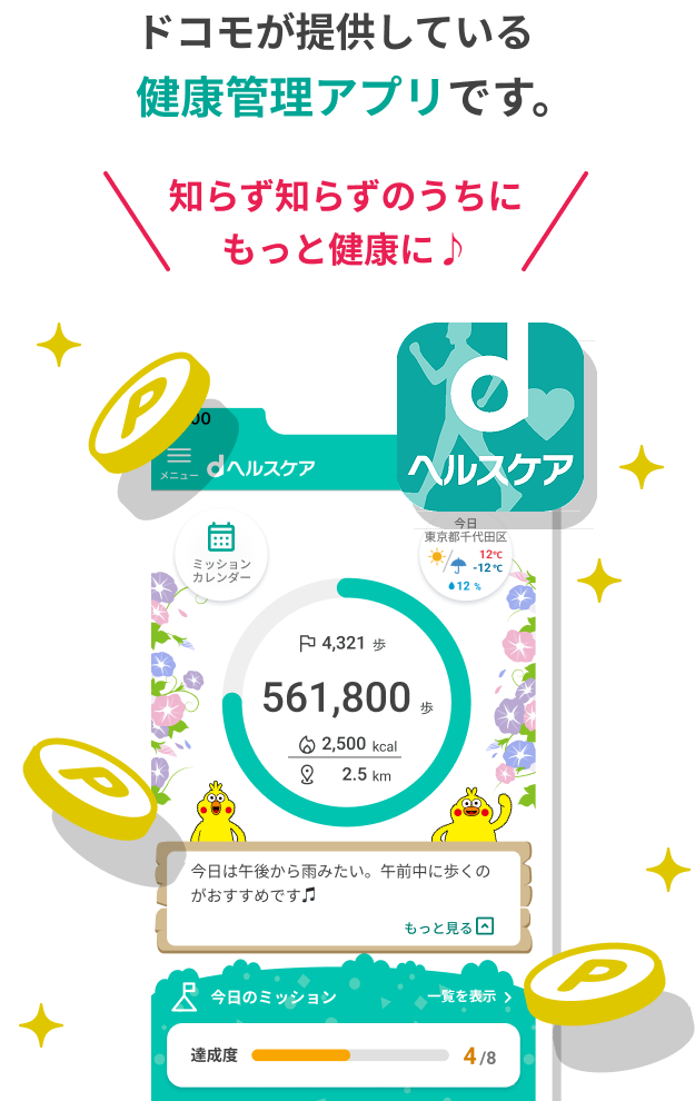 毎日アプリ内に配信される「健康ミッション」をクリアすることで、抽選でdポイントがもらえます!