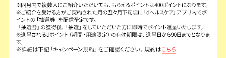 3.ご紹介する方とご紹介を受ける方ともに、ご紹介を受ける方がご契約された月の翌々月のポイント進呈時点まで継続してdヘルスケアを有料契約されていること。