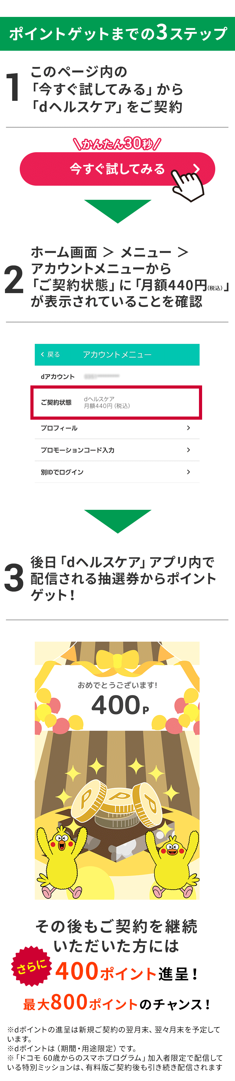 ※1回目のポイント進呈から2回目のポイント進呈の間にdヘルスケア(400円)のご契約を解約すると2回目のポイント進呈「抽選券」の配信対象外となりますのでご注意ください。