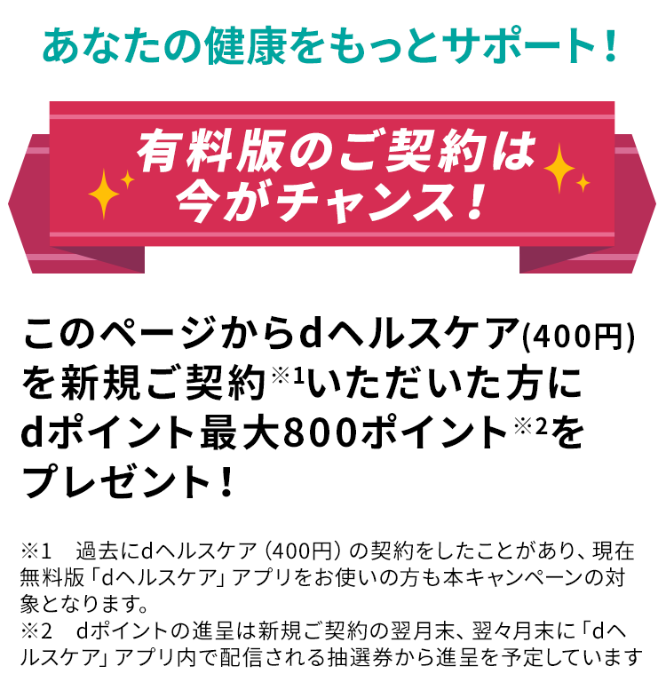 ※1 過去に「dヘルスケア(400円)」の契約をしたことがあり、現在解約されていて「dヘルスケア」アプリのご利用がない方がキャンペーン期間中に再度ご契約いただいた場合も本キャンペーン対象となります。また、過去に「dヘルスケア(400円)」の契約をしたことがあり、解約したのち、現在「dヘルスケア(無料版)」をお使いの方が、本キャンペーン中に再度ご契約をいただいた場合も本キャンペーン対象となります。 なお、どちらの場合も上記条件を満たす必要があります。また、どちらの場合も、「dヘルスケア(400円)」を再度ご契約の場合、「初回31日間無料」は適用外となりますのでご注意ください。