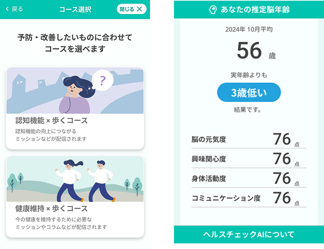 dヘルスケア有料版ではコース選択で認知機能向上を目的とした「認知機能×歩くコース」を選択できます。このコースではヘルスチェックAIにてご自身の脳年齢を確認できたり、選択したコースに応じた最適なミッションが配信されます。ぜひご確認ください!