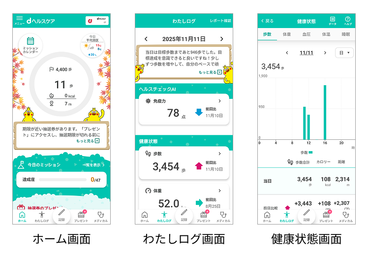 ※2025年11月26日(水)のアプリアップデート(バージョン20.4.13)後、ヘルスコネクトで歩数データ連携されることで、過去7日分の「わたしログ」の歩数が正しく表示されます。大変申し訳ございませんが、過去8日以前の歩数データにつきましては連携されませんので、必要に応じて手入力での登録をお願いいたします。