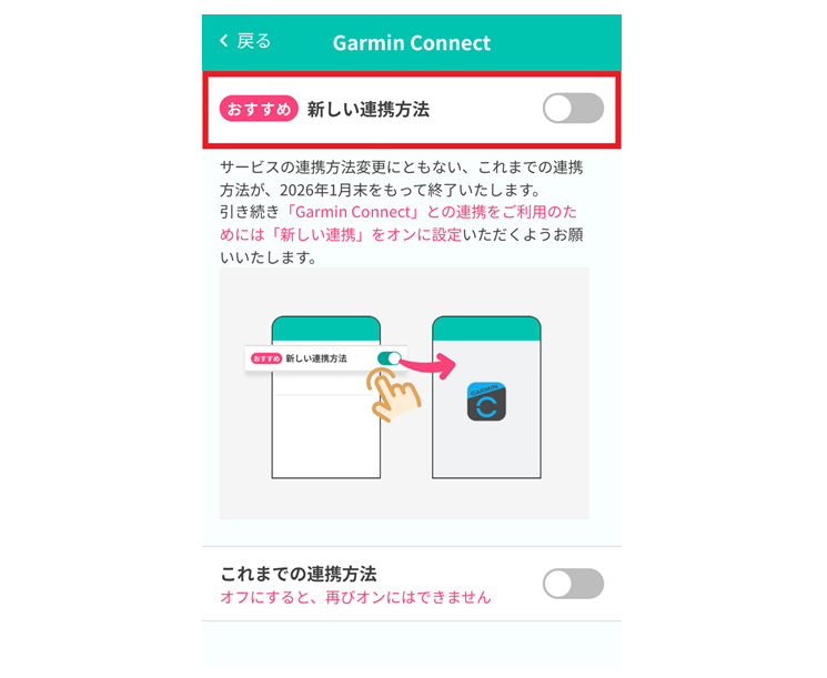 連携サービス設定でGarmin Connectの「新しい連携方法」がONになっているお客さま