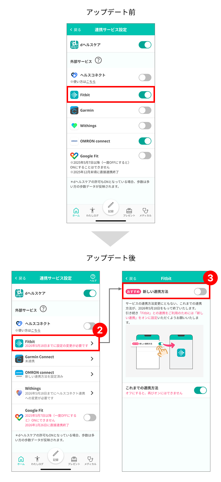 アップデートの前に、dヘルスケアの「連携サービス設定」がONになっていたサービスは、アップデート後に設定変更が必要です。2026年5月19日(火)以降も引き続き利用するためには、以下の手順で設定を変更してください。