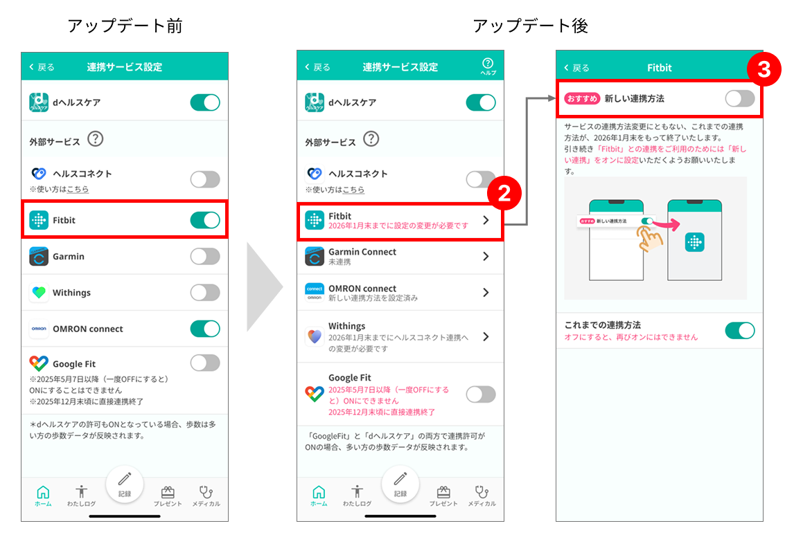 再設定されなかった場合は、2026年1月末以降、各連携サービス設定はOFFとなり、再設定が完了するまで歩数などのデータ連携がされませんのでご注意ください。